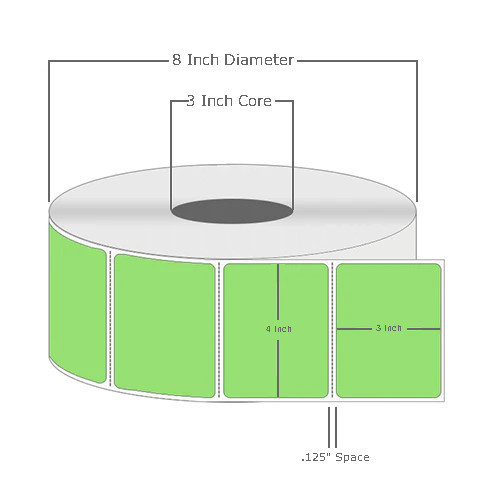 4" x 3", Thermal Transfer, Perforated, Roll, 3" Core, Coated, General Use, Fluorescent Green, $29.50 per Roll in 4 Roll Case
