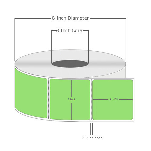 4" x 4", Thermal Transfer, Perforated, Roll, 3" Core, Coated, General Use, Fluorescent Green, $33.25 per Roll in 4 Roll Case