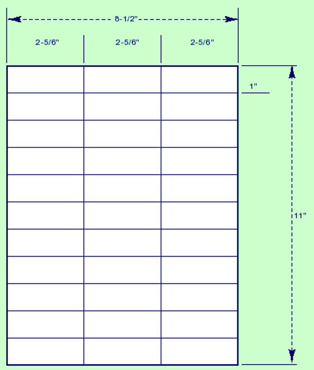 | | Width & Depth | 2-5/6" x 1" | | Repeat Across | 2-5/6" | | Repeat Down | 1" | | Labels Across | 3 | | Labels down | 11 | | Labels / sheet | 33 | | Labels / box | 33,000 | | Weight | 24 lbs | | Face Stock | 50lb Face / 50lb Liner | | Adhesive | Permanent | Ganson's Labels for laser printers, ink jet printers and photocopiers - We use a premium grade face stock to resist abrasion during scanning.