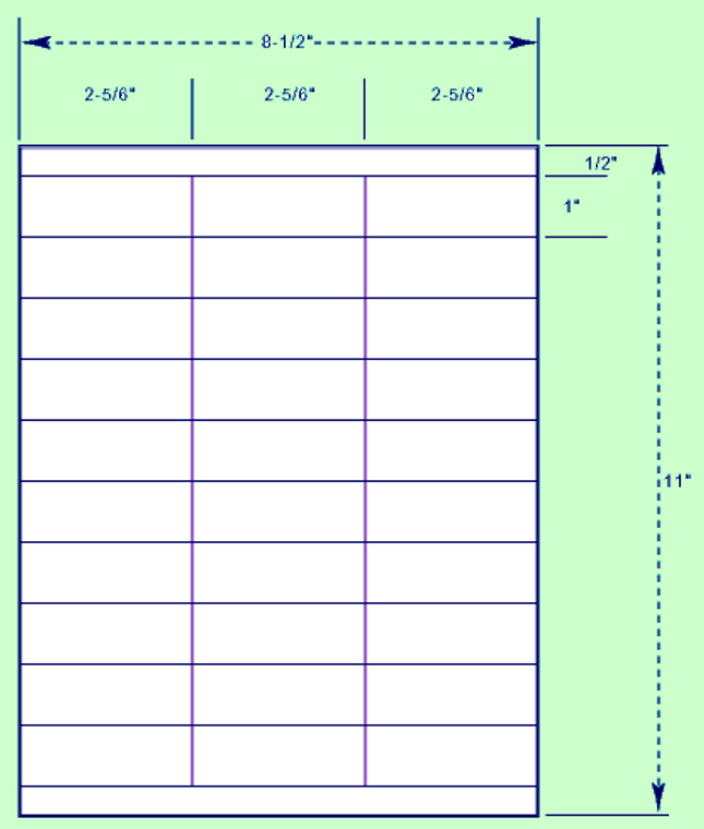 | | Width & Depth | 2-5/8" x 1" | | Repeat Across | 2-3/4" | | Repeat Down | 1" | | Labels Across | 3 | | Labels down | 10 | | Labels / sheet | 30 | | Labels / box | 30,000 | | Weight | 24 lbs | | Face Stock | 50lb Face / 50lb Liner | | Adhesive | Permanent | | 1/4" Gripper Margin At Top & Bottom Of The Sheet | Ganson's Labels for laser printers, ink jet printers and photocopiers - We use a premium grade face stock to resist abrasion during scanning.