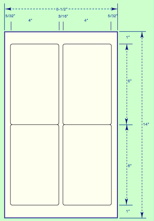 | | Width & Depth | 4" x 6" | | Repeat Across | 4-1/8" | | Repeat Down | 6" | | Labels Across | 2 | | Labels down | 2 | | Labels / sheet | 4 | | Labels / box | 4,000 | | Weight | 24 lbs | | Face Stock | 50lb. Face / 50lb. Liner | | Adhesive | Permanent | | 1/4" Gripper Margin At Top & Bottom Of The Sheet | Ganson's Labels for laser printers, ink jet printers and photocopiers - We use a premium grade face stock to resist abrasion during scanning.